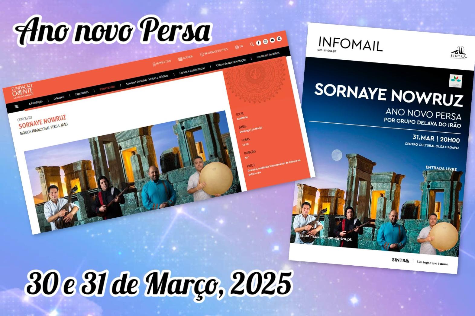 Por ocasião do Nowruz 1404, felicitamos os nossos compatriotas e as pessoas de língua persa que vivem em Portugal e informamo-los que o "Grupo Del Ava" vai realizar dois concertos de música tradicional em Lisboa e Sintra, durante 2 dias do Nowruz: